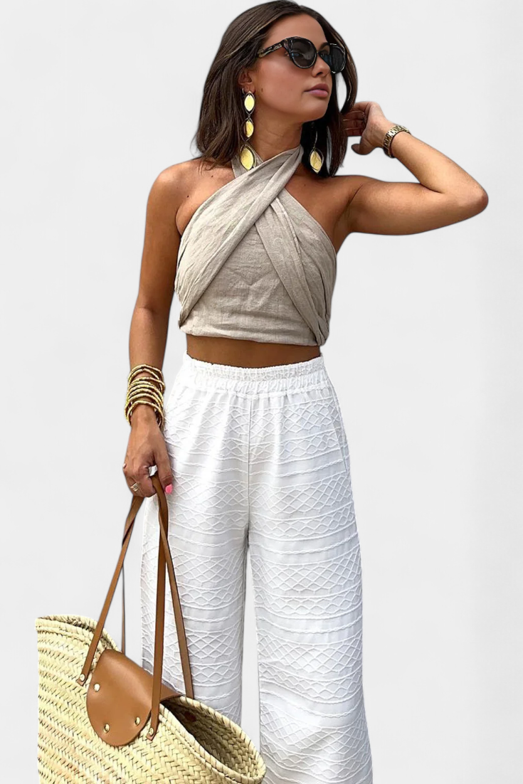 Refinado y llamativo, el top Lena redefine el verano con su escote cruzado halter, espalda fruncida y lazo largo. Perfecto para combinar con pantalones de tiro alto o faldas vaporosas, este top aporta un aire sofisticado sin perder frescura y ligereza.