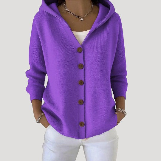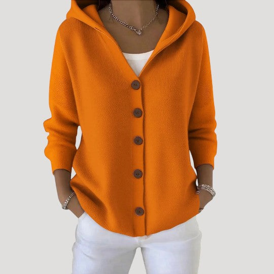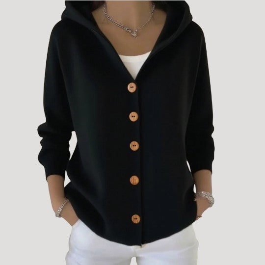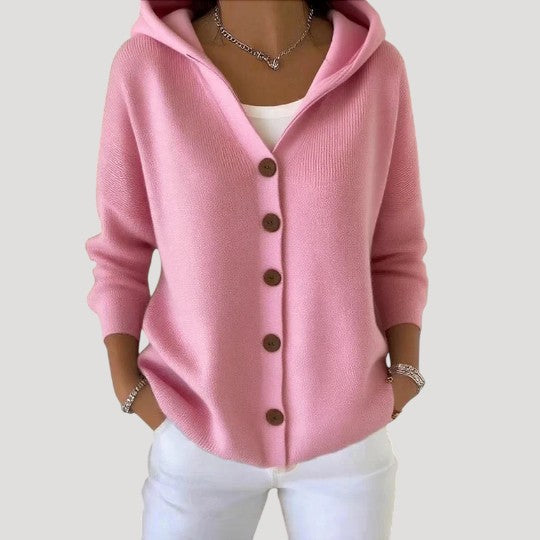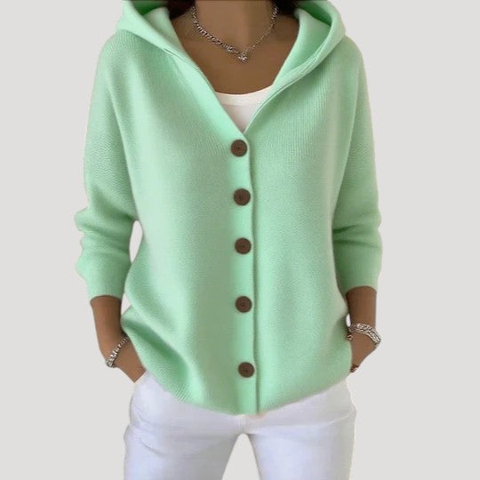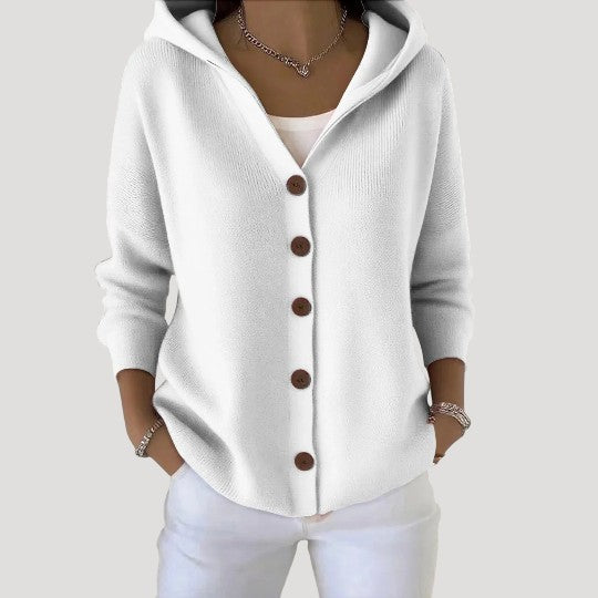 La chaqueta de punto con capucha Lunara está confeccionada con una malla suave que abriga sin resultar pesada. Su corte holgado permite llevarla fácilmente sobre una camiseta o blusa, mientras que la capucha aporta un acogedor efecto cocoon, perfecta para los momentos más frescos.